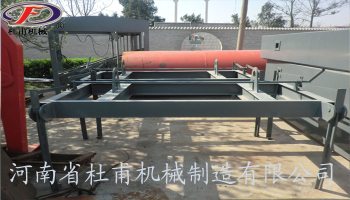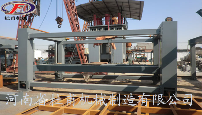 翻轉(zhuǎn)吊具把模具空中翻轉(zhuǎn)90度以后脫模把坯體連同模具側(cè)板放置在切割臺上,縱向切割裝置通過電機帶動自身行走,對放置于切割臺上的坯體進行行走切割,切割完成后行走至?xí)和N恢茫瑱M向切割裝置通過電機帶動自身行走到坯體中央停止后再進行水平式切割,橫切架自上而下垂直降落切割直至上升復(fù)位