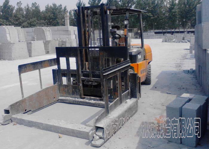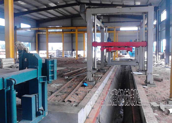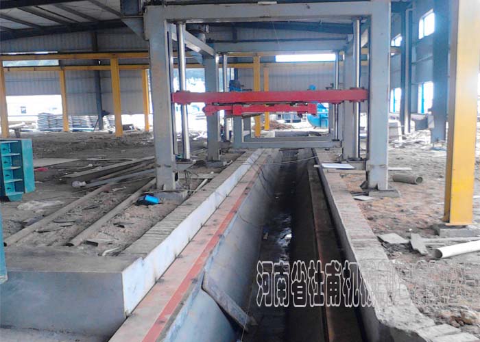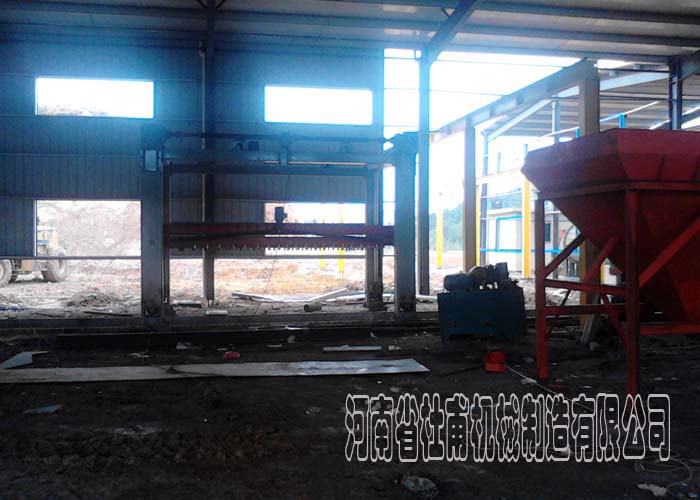 翻轉吊具把模具空中翻轉90度以后脫模把坯體連同模具側板放置在切割臺上,縱向切割裝置通過電機帶動自身行走,對放置于切割臺上的坯體進行行走切割,切割完成后行走至暫停位置,橫向切割裝置通過電機帶動自身行走到坯體中央停止后再進行水平式切割,橫切架自上而下垂直降落切割直至上升復位